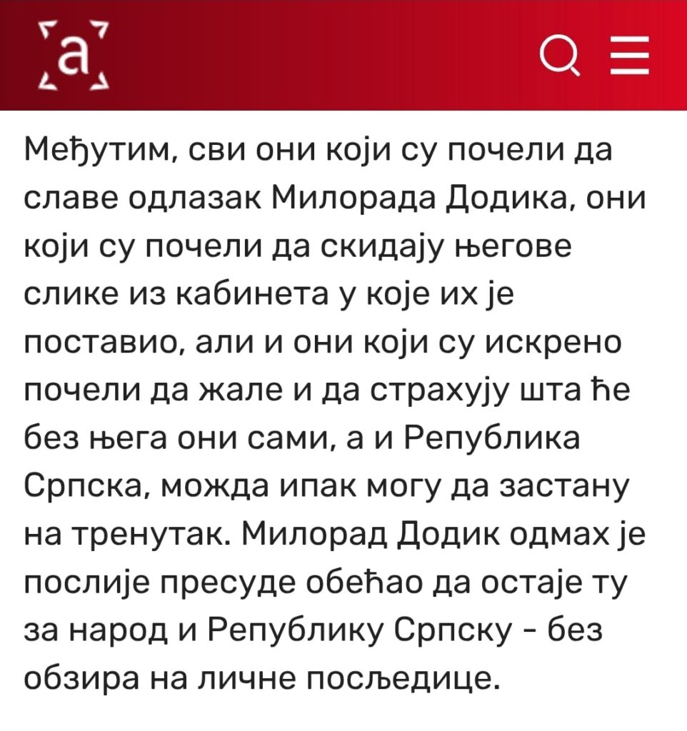 “Međutim, svi oni koji su počeli da slave odlazak Milorada Dodika, oni koji su počeli da skidaju njegove slike iz kabineta u koje ih je postavio, ali i oni koji su iskreno počeli da žale i da strahuju šta će bez njega oni sami, a i Republika Srpska, možda ipak mogu da zastanu na trenutak.