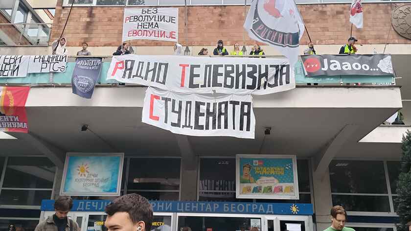 Blokada RTS-a u Takovskoj ulici i dalje traje, uz obustavljen saobraćaj. Studenti, podržani građanima i motociklistima, protestuju već od sinoć, zahtevajući raspisivanje novog konkursa za članove Saveta regulatornog tela za elektronske medije ili gašenje RTS-a.