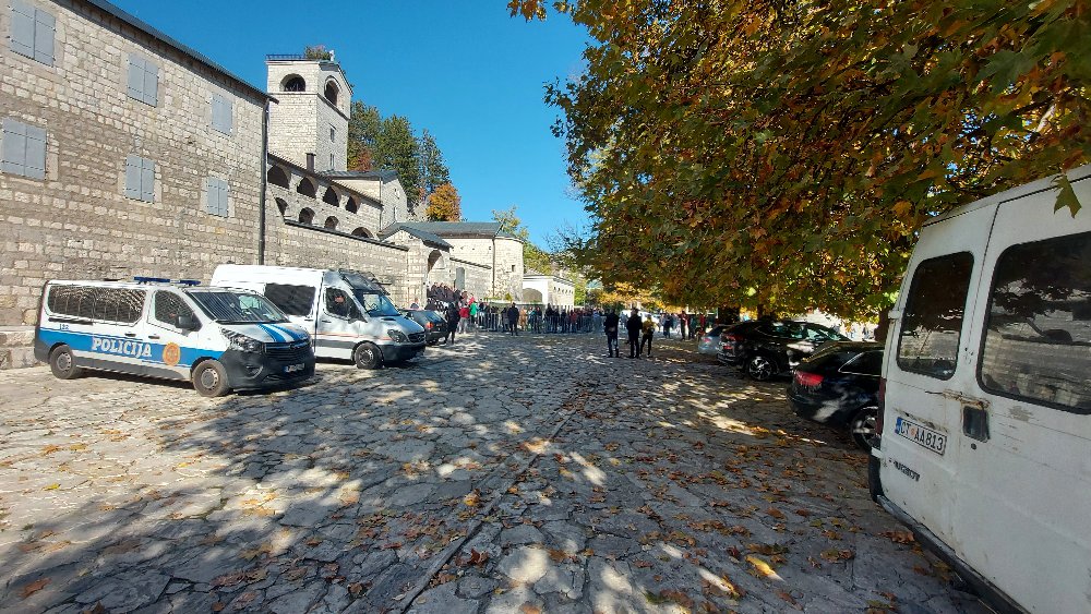 Ispred manastira je pojačano prisustvo policije, postavljena je ograda uz koju vjernici ulaze u manastir, a brojni građani sa crnogorskim nacionalnim obilježjima su pjevali crnogorske pjesme.