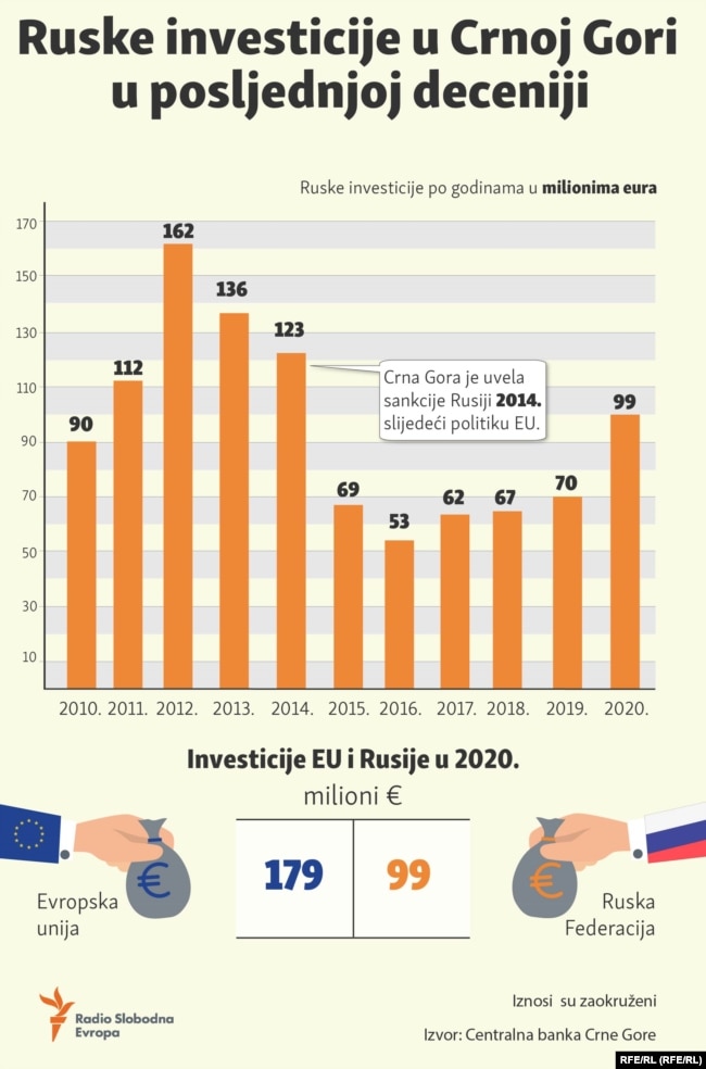 Direktne strane investicije od 2006. do 2019. godine iz Rusije u Crnu Goru iznose 1,4 milijarde eura, od čega kupovina nekretnina predstavlja najveći dio investicija, oko jedne milijarde dolara.