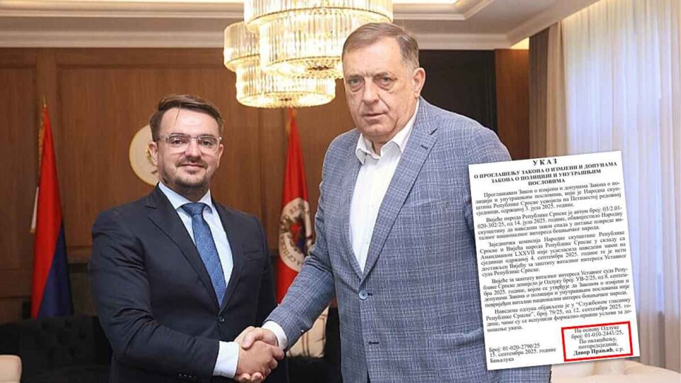 Potpredsjednik Republike Srpske Davor Pranjić potpisao je ukaz o proglašenju Zakona o izmjenama i dopunama Zakona o policiji i unutrašnjim poslovima, čime je ozvaničeno da je Milorad Dodik na njega prenio ovlaštenja nakon što mu je CIK BiH na osnovu pravosnažne presude Suda BiH oduzeo mandat predsjednika Republike Srpske, objavio je portal Capita. ba.