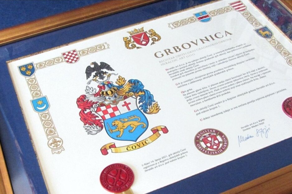 “U plavom polju zlatni koračajući lav drži mač u desnici. Glava štita raskoljena. Desno crveno-srebrena šahovnica, lijevo u srebrenom polju crveni latinski križ. Plašt crveno-srebren i plavo-zlatan. Na kacigi s vijencem (crven-srebren-plavi-zlatni-crven-srebren) stoji orao uzdižućih krila, zlatno naoružan, u kandžama drži poskoka. Grb obitelji Čović 14. juna ove godine registriran je u Registru obiteljskih grbova Heraldic arta u Rijeci”, navedeno je.