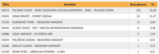 U utrci za predsjednika Republike Srpske, prema podacima Centralne izborne komisije, a nakon 85 posto prebrojanih glasova, 103 osobe su glasale za Dodika, 62 za Senada Bratića iz Pokreta Država te 13 osoba za nezavisnog kandidata Ćamila Durakovića.