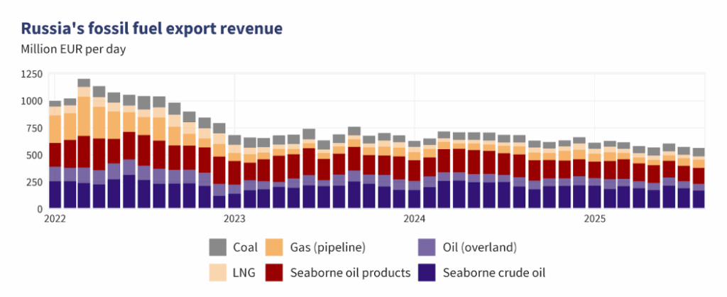 U augustu su mjesečni prihodi Rusije od izvoza fosilnih goriva pali za 2% u odnosu na prethodni mjesec, na 564 miliona eura dnevno, što je treći mjesec zaredom u kojem su prihodi Rusije od izvoza fosilnih goriva pali.