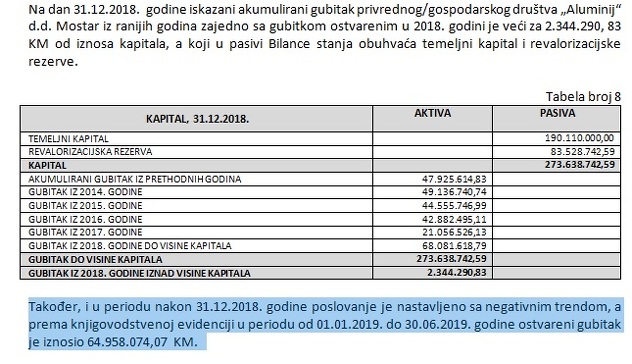 “Također, i u periodu nakon 31. decembra 2018. godine poslovanje je nastavljeno sa negativnim trendom, a prema knjigovodstvenoj evidenciji u periodu od 01. januara 2019. do 30. juna 2019. godine ostvareni gubitak je iznosio 64, 9 miliona KM”, navedeno je u izvještaju.