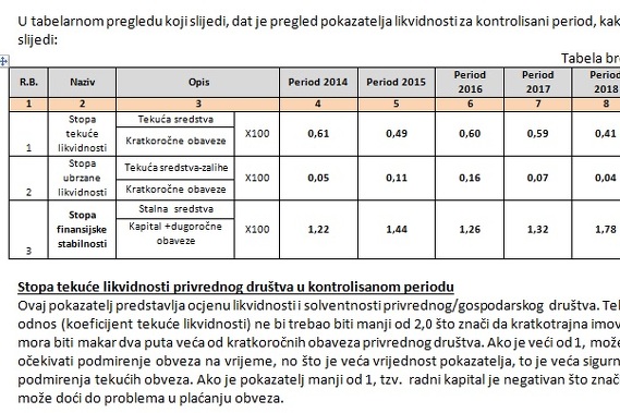 Nadalje, navode inspektori na dan 31. decembar 2018. godine, za plaćanje svakih 100 KM kratkoročnih obaveza, a kratkoročne obaveze su iznosile 234,8 miliona KM, Aluminij je imao 4 feninga novčanih sredstava i potraživanja koja su iznosila 3,4 miliona KM “što je vrlo indikativan i po našem sudu zabrinjavajući pokazatelj u poslovanju privrednog društva”.