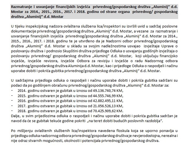 “Uprava privrednog društva je u većini slučajeva zaključenim ugovorima sa kupcima prouzrokovala štetu Aluminiju na način da se prodajna cijena proizvoda formirala na razinu koja je ispod ekonomski opravdane cijene što je rezultiralo stvaranje gubitka prodajom proizvoda (trupci, inogt, blok, žica”, kaže se u jednom od zaključaka.