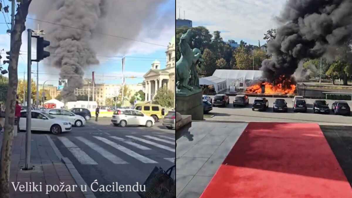 Kako se vidi na snimcima, gori veliki šator koji se nalazi između zgrade Skupštine i Ćacilenda.