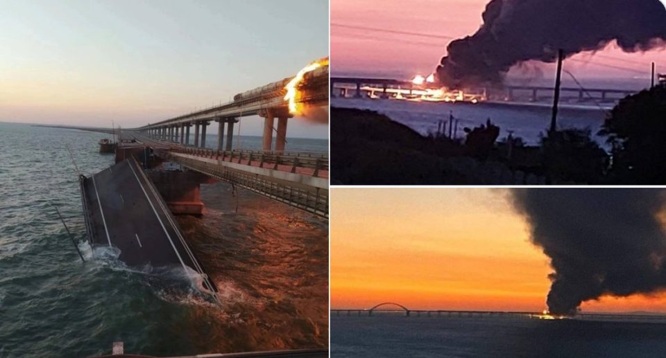 On Putin’s birthday, Kerch bridge connecting occupied #Crimea and #Russia has been detonated with significant damage. pic.twitter.com/c7MXw71Mhs