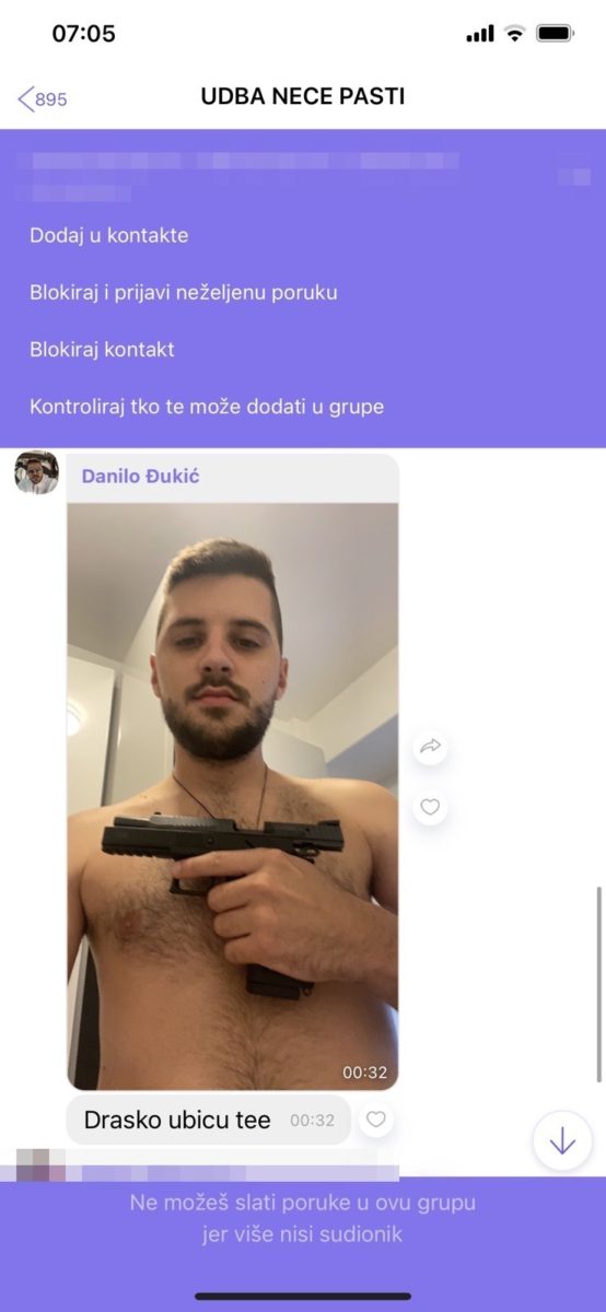 Slika je poslana sa broja telefona koji je na viberu snimljen kao Danilo Đukić, a u poruci je pisalo “Draško ubiću te”.