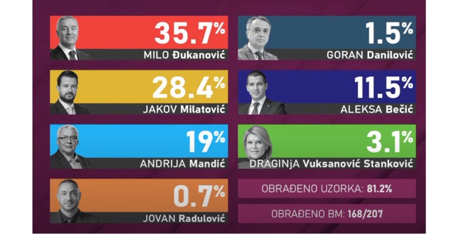 Prema rezultatima 81,2% obrađenih listića Milo Đukanović osvojie 35,7% dok je Jakov Milatović dobio 28.4%. Kandidat pro srpskih stranaka Andrija Mandić dobio je 19 odsto i više nema šanse da uđe u drugi krug.