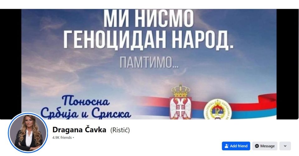 Ono što je zanimljivo jeste da na naslovnoj stranici svog profila drži propagandni slogan iz zajednićke kampanje Dodika i Vučića pred usvajanje rezolucije o Srebrenici na kojoj stoji poruka “mi nismo genocidan narod” iako se Čavka ne izjašnjava kao pripadnica naroda na koji se ovde misli.