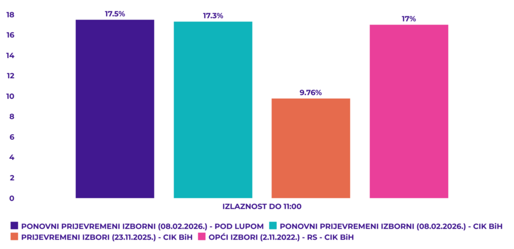 Koalicija „Pod lupom“ prati i informacije o izlaznosti na izborima. Zabilježena izlaznost na Ponovnim prijevremenim izborima na biračkim mjestima gdje su posmatrači Koalicije „Pod lupom“ do 11:00h je 17,5%. Poređenja radi, izlaznost na prethodnim Opštim izborima 2022. u Republici Srpskoj do 11:00h je bila 17%, a na Prijevremenim izborima održanim 23.11. 2025. godine, izlaznost je bila svega 9,7%. Radi se u većoj izlaznosti u odnosu na Prijevremene izbore koja je skoro jednaka onoj na prethodnim Općim izborima.