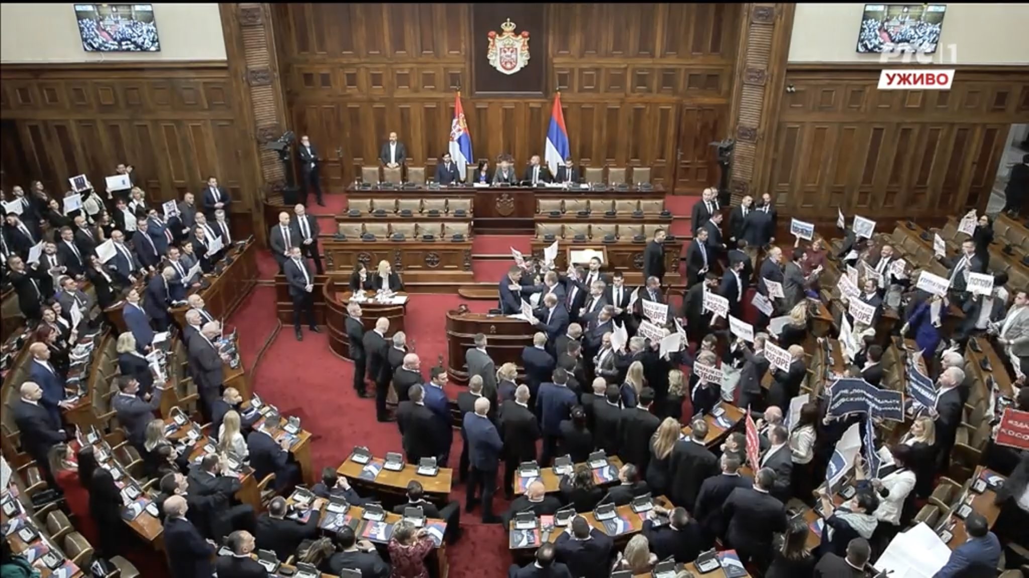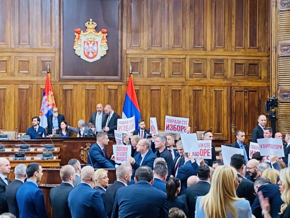 Na samom početku, nakon intoniranja državne himne „Bože pravde“, poslanici „Srbije protiv nasilja“ i Koalicije NADA izašli su iz svojih klupa i počeli da duvaju u zviždaljke.