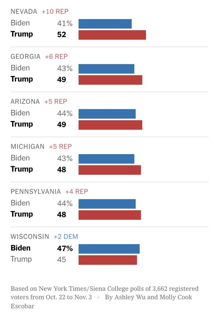 Među mogućim glasačima, Trump je predvodio Bidena u četiri od šest država u političkoj trci (Arizona, Georgia, Nevada i Pennsylvania), izjednačio u drugoj (Michigan) i iza Bidena samo u jednoj (Wisconsin).