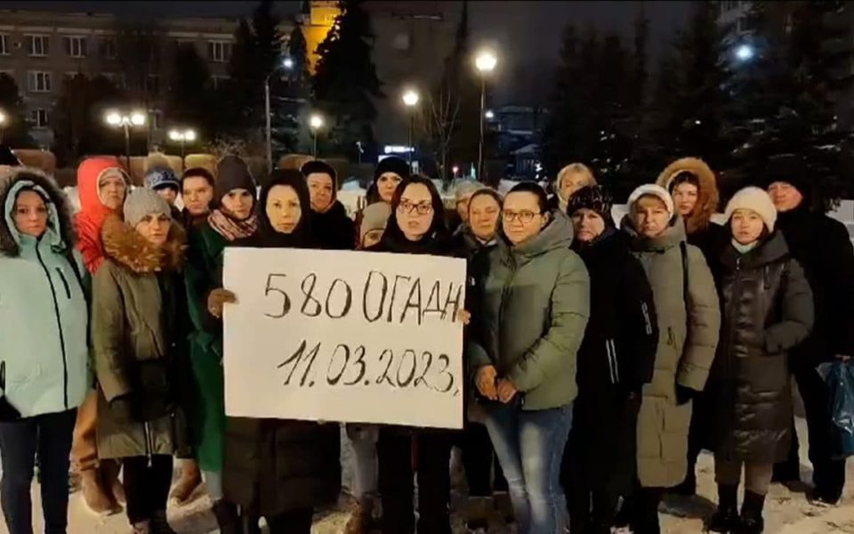 Žene na snimku kažu da su njihovi voljeni bili “prisiljeni da se pridruže grupama za napad” početkom marta, iako su od mobilizacije prošli samo četiri dana obuke. Dvije žene zajedno drže natpis na ruskom.