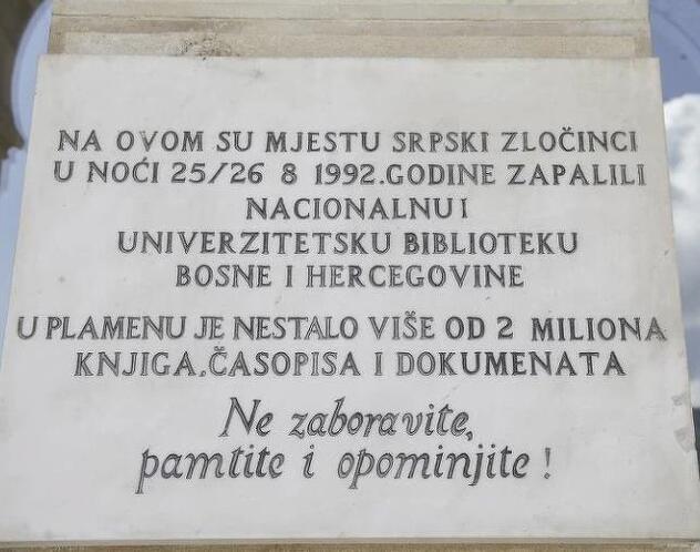 Na ploči na ulazu u Vijećnicu piše: “Na ovom su mjestu srpski zločinci u noći 25/26. 8. 1992. godine zapalili Nacionalnu i univerzitetsku biblioteku Bosne i Hercegovine. U plamenu je nestalo više od dva miliona knjiga, časopisa i dokumenata. Ne zaboravite, pamtite i opominjite!”