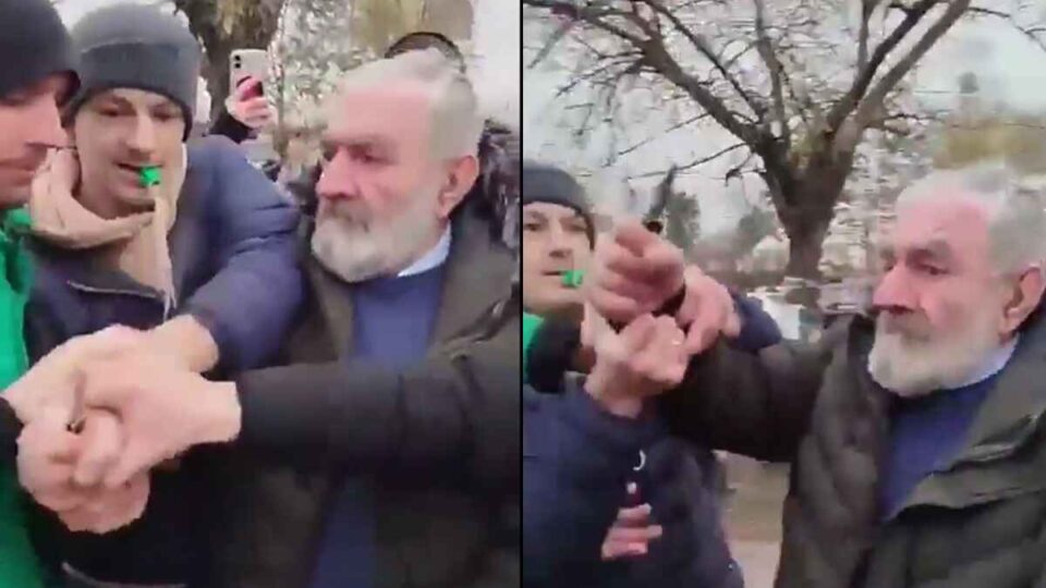 Kako se može videti na snimku, stariji muškarac je krenuo ka studentima koji su blokirali saobraćaj u Novom Sadu, držeći nož u ruci.