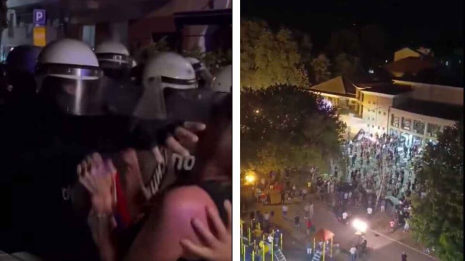 Jedna od nedopustivih scena dolazi iz Vračara gdje je policijski kordon u opremi za razbijanje demonstracija potiskivao građane okupljene ispred SNS-a.