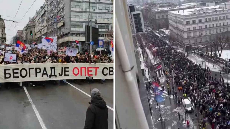 Na čelu studentske kolone je veliki transparent “Beograd je opet svet”, a tu je niz manjih sa nazivima fakulteta koji su u blokadi, kao i zahtevima za utvrđivanje odgovornosti za nesreću u Novom Sadu. Okupljeni nose i državne zastave Srbije, a prisutno je i studentsko obezbeđenje, javio je reporter agencije Beta.