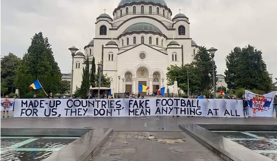 “Izmišljenje države, to je lažni fudbal za nas, oni nama ne znače ništa”, pisalo je na transparentu rumunskih navijača koji su podigli u Beogradu.