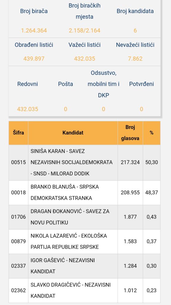Prednost kandidata Dodikovog SNSD-a Siniše Karana smanjena je sa 12 hiljada koliko je iznosila sinoć na 8.369 glasova.