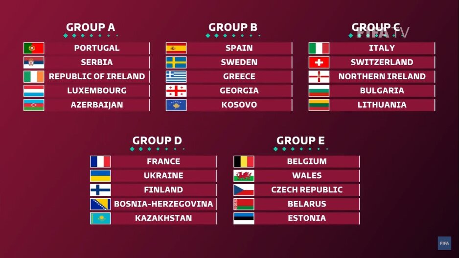 17:35 – Kuglice će biti izvučene u Cirihu, a 55 selekcija će biti raspoređeno u 10 grupa. U pet će biti pet selekcija, dok će se u preostalih pet nalaziti šest reprezentacija.