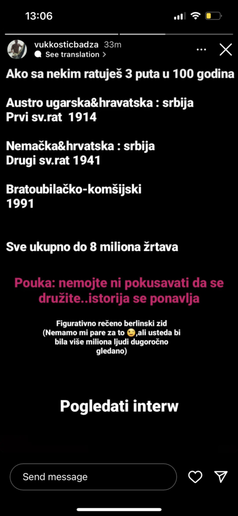 “Ako sa nekim ratuješ tri puta u 100 godina. Austrougarska i Hrvatska: Srbija, Prvi svjetski rat 1914. godina. Njemačka i Hrvatska: Srbija – Drugi svjetski rat 1941. godine. Bratoubilačko-komšijski rat 1991. godina. Sve ukupno osam miliona žrtava. Poruka – Nemojte ni pokušavati da se družite, historija se ponavlja. Figurativno rečeno, Berlinski zid – nemamo mi pare za to, ali ušteda bi bila više miliona ljudi dugoročno gledano. Pogledajte intervju“, napisao je Vuk Kostić na Instagramu.