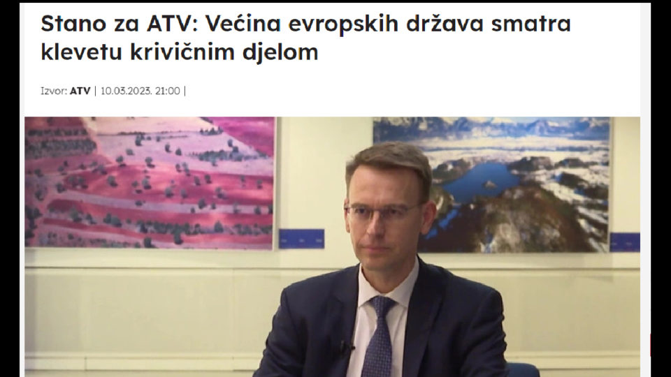 “Ovaj naslov i interpretacija rečenog za ATV Banja Luka nisu tačni. Nije se radilo o broju EU zemalja sa zakonima o kleveti, već o važnosti slobode govora i medija za EU i kako bi svaki zakon donesen u BiH trebao biti u skladu s EU standardima”, napisao je na svom Twitter nalogu i dodao: