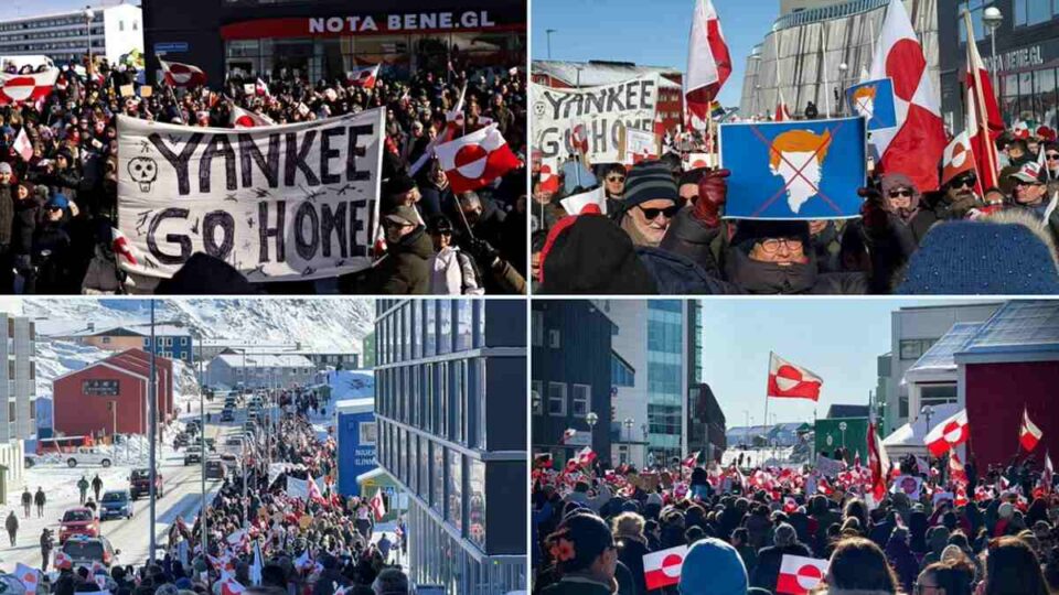 Na snimkama se vidi kako prosvjednici okupljeni u glavnom gradu Nuuku mašu grenlandskim zastavama i drže transparente s porukama poput: „Poštujte suverenitet Grenlanda“, „Mi nismo na prodaju“ i „Jenkiji, idite doma“. Protesti su održani i u drugim gradovima na otoku.