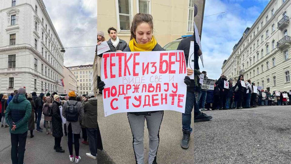 Ispred Ambasade Srbije u Beču danas je održan protest sa kojeg su poslate poruke podrške studentima u Srbiji koji blokiraju univerzitete i traže odgovornost za nesreću koja je dovela do smrti 15 osoba u Novom Sadu.