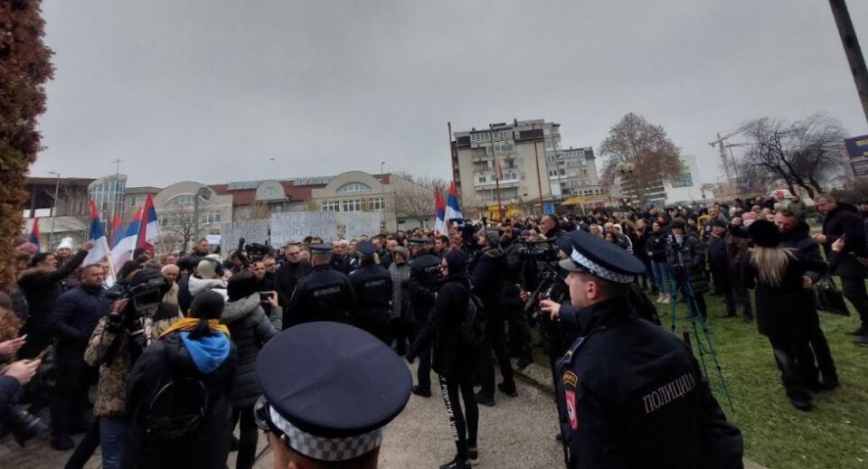 Ispred zgrade policijske uprave u Bijeljini održavaju se protesti zbog hapšenja bijeljinskog gradonačelnika Ljubiše Petrovića.