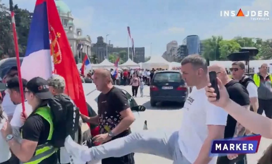 Kada su studenti i veterani stigli do ograđenog mjesta ispred Skupštine Srbije, Vladimir Mandić je snimljen kako jednog mladića šutira nogom.