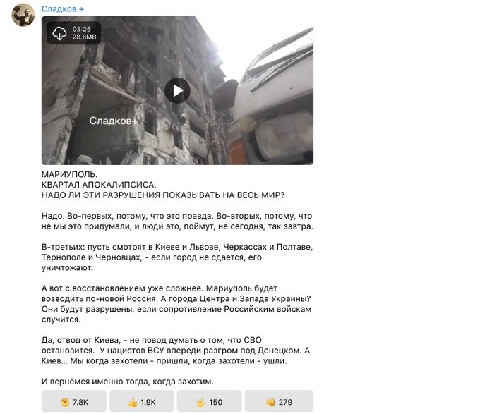 Dopustite mi da citiram dopisnika “Sve-ruske TV i radiodifuzne kompanije” s 577 158 pratilaca: “Mariupol. Okrug Apokalipse. Trebamo li ga pokazati cijelom svijetu? Da. Neka Kijev, Lvov, Poltava, Ternopolj vide: ako se grad ne preda, bit će uništen.”