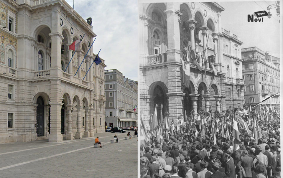 Jedan fotografija prikazuje okupljene građane ispred današnje “Palate austrijskog poručnika” koja se nalazi na glavnom gradskom trgu koji danas nosi naziv “Trg jedinstva Italije”.