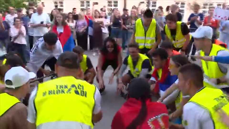 Studenti pevaju „Ko ne skače, taj je ćaci“.