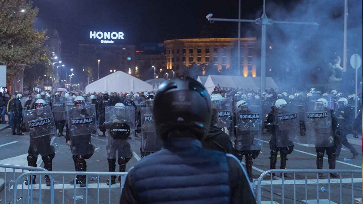 Ka građanima koji podržavaju Dijanu Hrku počela su da lete pirotehnička sredstva i topovski udari, a policija je prošla ogradu iza koje je do tada stajala.