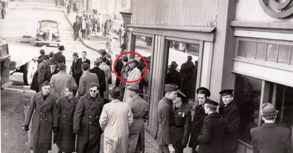 Fotografija snimljena 1943. godine u glavnom gradu Islanda, Reykjaviku, prikazuje gomilu mještana i vojnika iz Drugog svjetskog rata kako hodaju pločnikom.