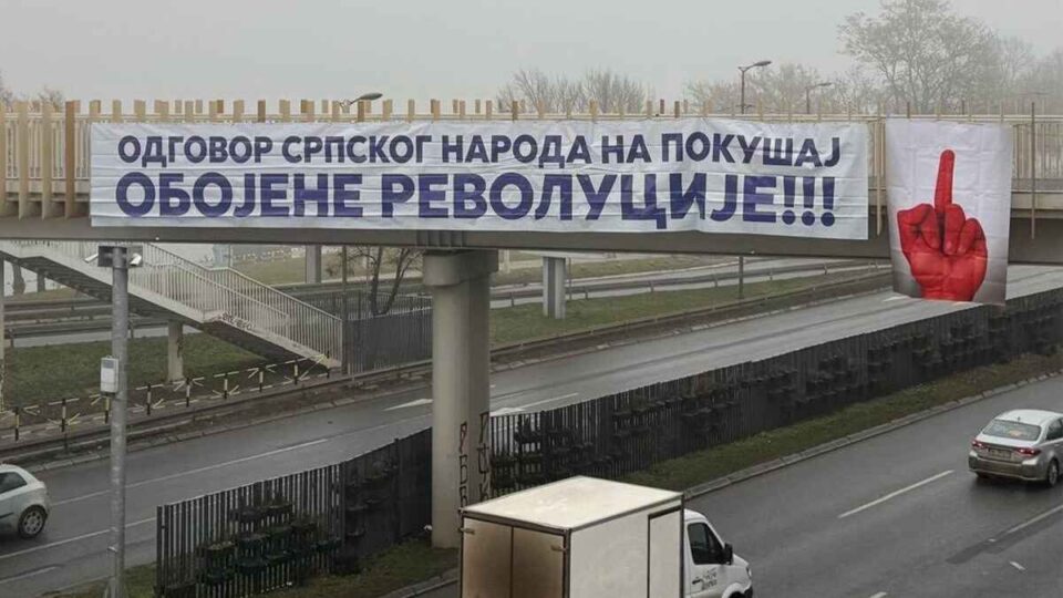 Na nekoliko mesta u Beogradu jutros su osvanuli transparenti sa natpisom “Odgovor srpskog naroda na pokušaj obojene revolucije” uz ilustraciju krvave ruke koja pokazuje srednji prst.