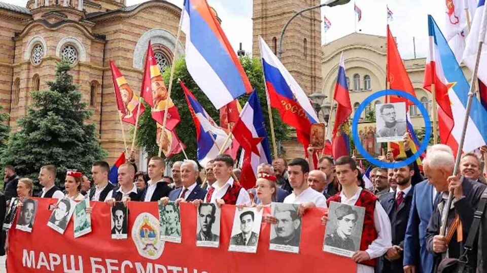 Iza prvog reda u kojem su većinom bile zastave SFRJ kako se vidi na fotografijam, učesnici su nosili zastave Rusije, Srbije, Zastava ruske pravoslavne vojske a jedan od učesnika nosio je sliku četničkog komandanta Draže Mihajilovića koji je nakon rata osuđen zbog saradnje sa fašistima i ratnih zločina.
