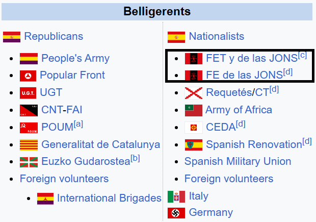 Falange Española bila je mala, ali militantna organizacija krajnje desnice. Imala je paramilitarne odrede i aktivno je učestvovala u nasilju protiv levičara i sindikalista. Kada je izbio Španski građanski rat, Falange se priključuju pobuni koju je predvodio fašistički diktator Francisco Franco. Franco je shvatio da treba da objedini sve nacionalističke struje pod svojom kontrolom. Zato je dekretom 1937. godine naterao Falangu da se ujedini sa karlistima (monarhistička tradicija) i drugim desničarskim grupama u jednu partiju – Falange Española