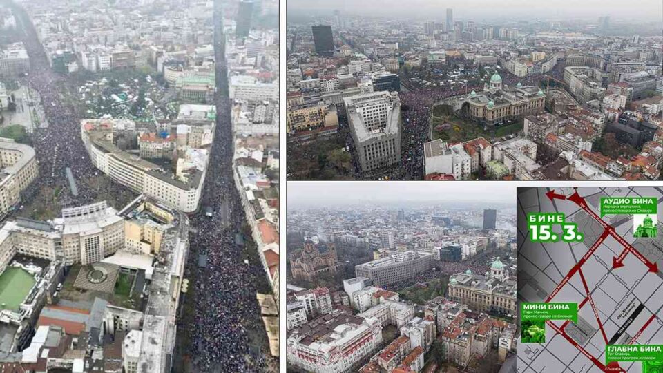 Desetine hiljada ljudi su, uprkos kiši, zaposjeli središnje ulice Beograda učestvujući u protestu „15. za 15.“ na koji je cijelu Srbiju pozvao studentski pokret, ali mnogi nisu uspjeli stići na početak skupa u 16 sati, jer je vlast na više načina opstruirala skup.