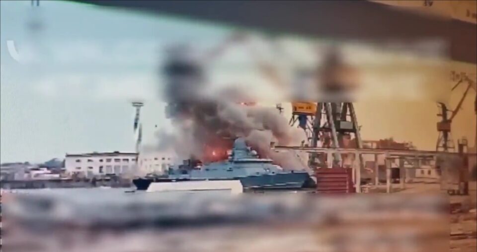 Tohle je ten okamžik, kdy ukrajinci trefili v sobotu jednu z nejmodernějších lodí ruské Černomořské flotily, raketovou loď Askold. Ta byla spuštěna na vodu teprve v roce 2021 a na palubě má řízené střely Kalibr, kterými russáci pravidelně odstřelují Ukrajinu. Super trefa! pic.twitter.com/VR1jZscpOq