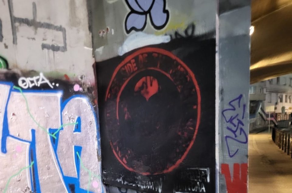 Pozadina murala je bila u crnoj boji, a na njemu je bila nacrtana crvena mrtvačka glava zaokružena crvenim krugom, sa napisom na engleskom jeziku: “Reverse side of the medal, true to yourself”.