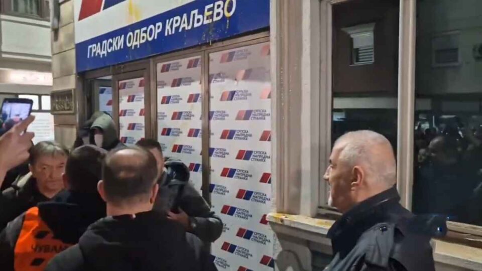 Kolona je zastala ispred stranačkih prostorija naprednjaka. Tada je usledila rasprava demonstranata i pristalica SNS koji su se nalazili u prostorijama, izađao je i gradonačelnik Kraljeva Predrag Terzić, a onda je usledila kanonada jajima na prostorije, javlja reporter N1.