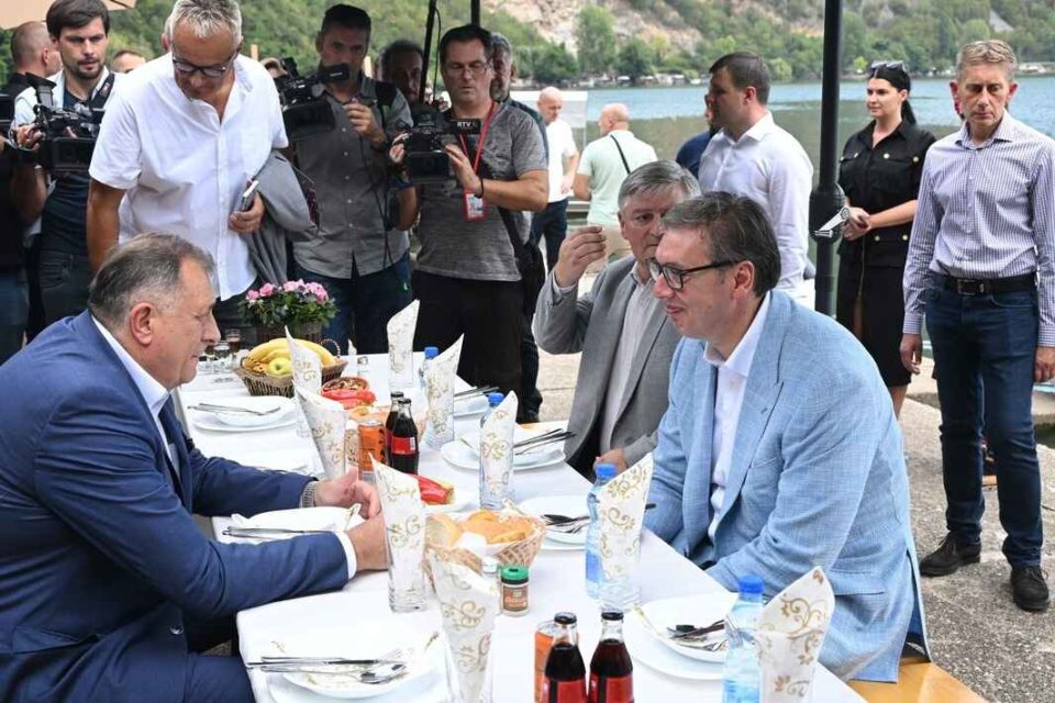 “Nisam lep kao Tito, ali za ovaj kraj dali smo više para nego Tito”, izjavio je Aleksandar Vučić koji je u Mali Zvornik i na Zvorničko jezero stigao zajedno sa Miloradom Dodikom, predsednikom Republike Srpske, čamcem.