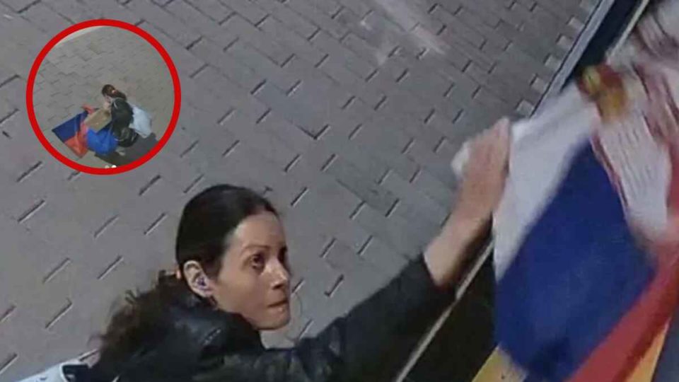 Sve to zabilježila je nadzorna kamera, a na snimku se vidi kako žena stoji pored zastave i gleda kako gori, dok građani prolaze i ne obražaju pažnju na to što radi, prenosi Telegraf.